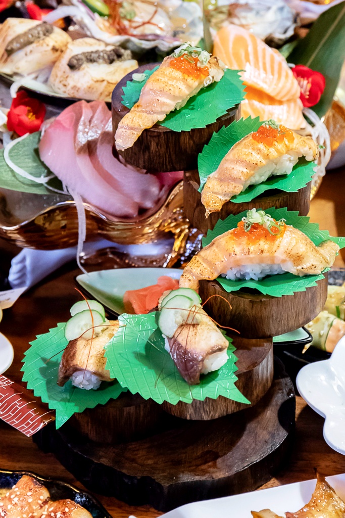綜合炙燒鮮魚握壽司(小)5只,這道的造型就像一顆具有弧度的小樹,盛裝著不同的握壽司環繞而上,簡單大方又富有層次感。