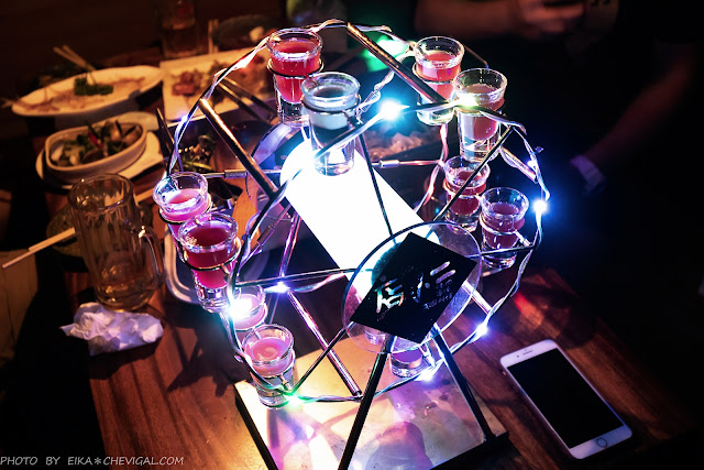 調酒的造型非常多款,像是超美蝴蝶酒、七彩摩天輪等等,通常是會隨機提供,每個人根本就拿起手機猛拍!如果不喝酒也會改提供飲料,店小二還會唱歌幫你們慶生!
