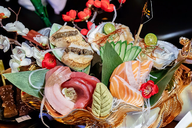 豪華生魚片(頂級)$1480元,這道的擺盤真的是太誇張了!各式海鮮就像珠寶一樣,經過精心的點綴再送至我們的眼前。裡面除了鮭魚、鮪魚及青甘,還有蟹膏生干貝與進口大生蠔。