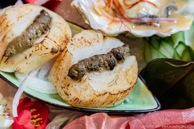 蟹膏生干貝有經過微微的炙燒,可以吃得到生食級干貝的多汁與鮮甜;不過表面的蟹膏海味真的會比較明顯一些,建議可以搭配芥末一起吃,大口咬下還蠻過癮的。