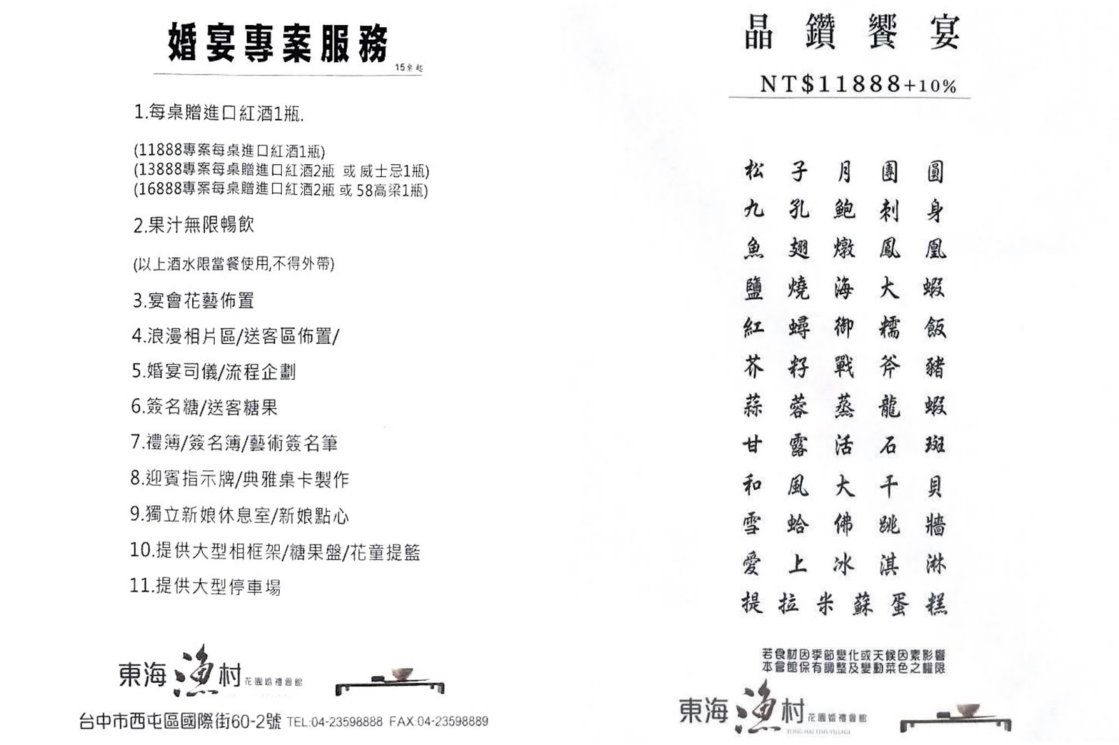 我們這天享用的是晶鑽饗宴 (11888+10%/桌),一共有12道菜,若想調整專案內的菜色,也都能向婚顧人員洽詢安排。