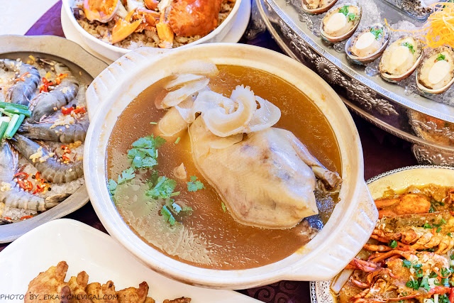 雪蛤佛跳牆,幾乎所有喜宴都少不了一道佛跳牆!以多種海鮮、乾貨經過長時間的燉煮,湯頭的風味不僅溫潤順口,還能吃到許多豐富食材,吃起來也蠻有飽足感的!