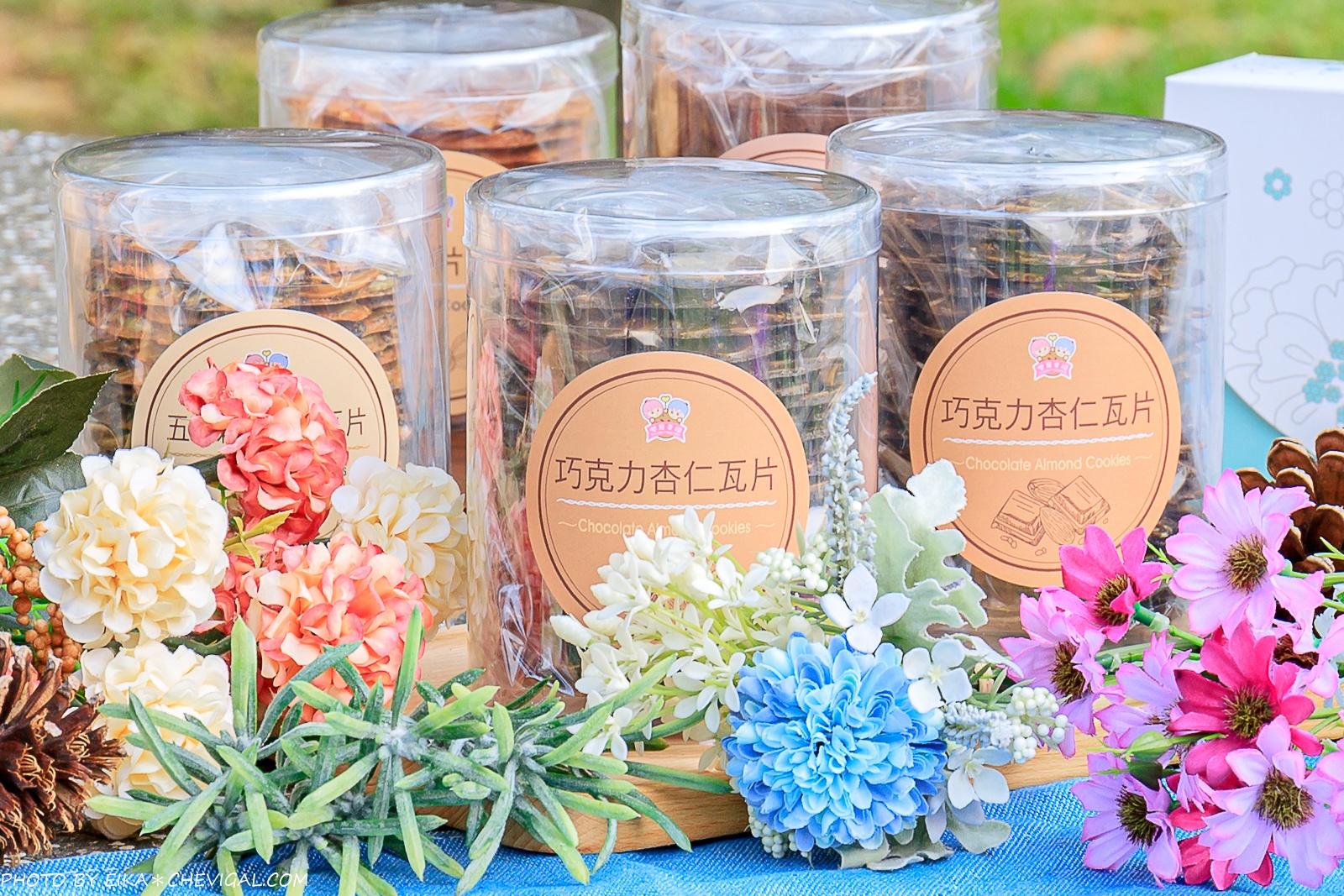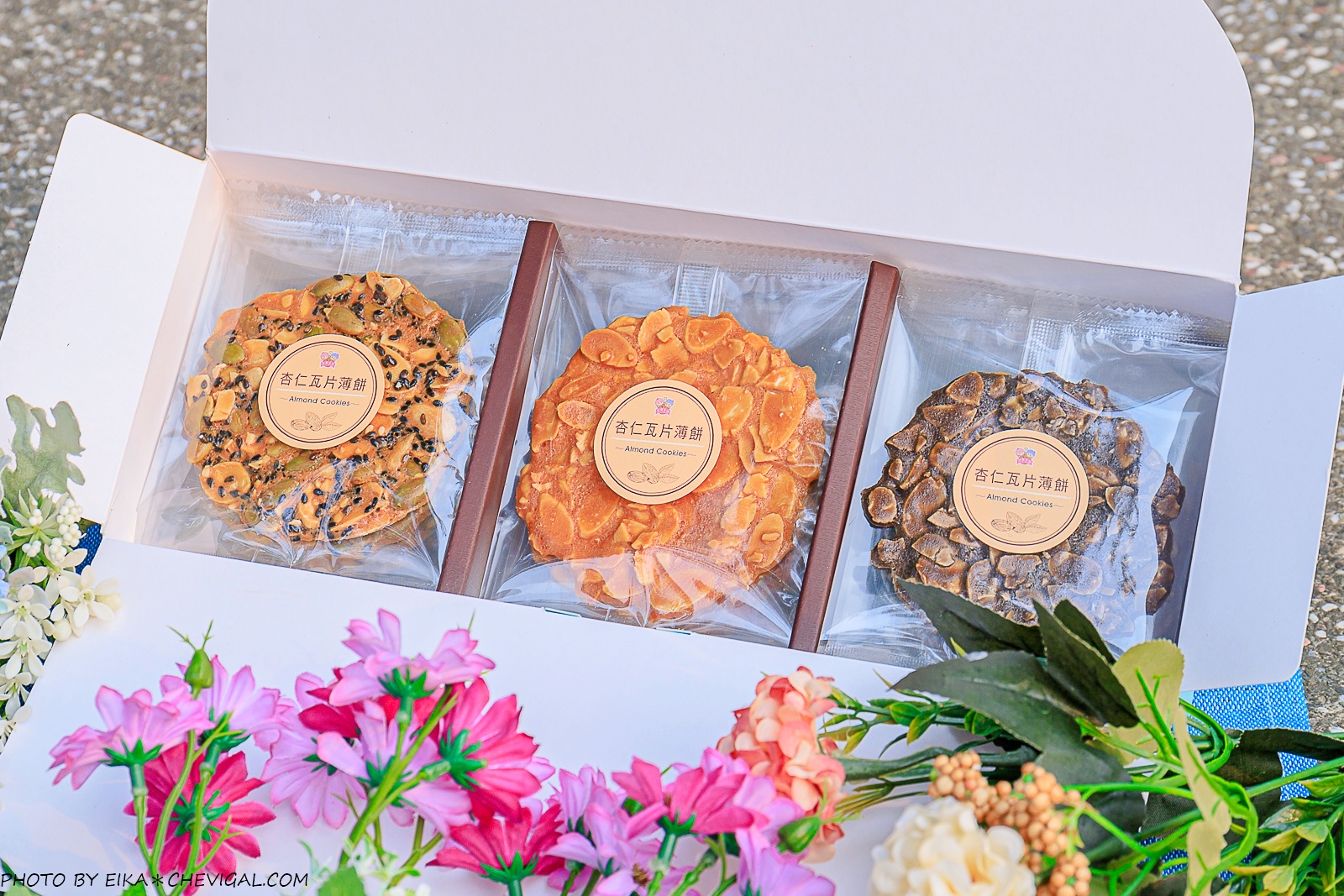 這裡目前有販售多種杏仁瓦片,另外也有不定期推出的台灣馬卡龍、土鳳梨酥與各種禮盒。杏仁瓦片大部份都是桶裝的形式販售,但是也有零售單片裝的杏仁瓦片,不過許多來買過的客人都覺得直接買桶裝的會比較划算XD