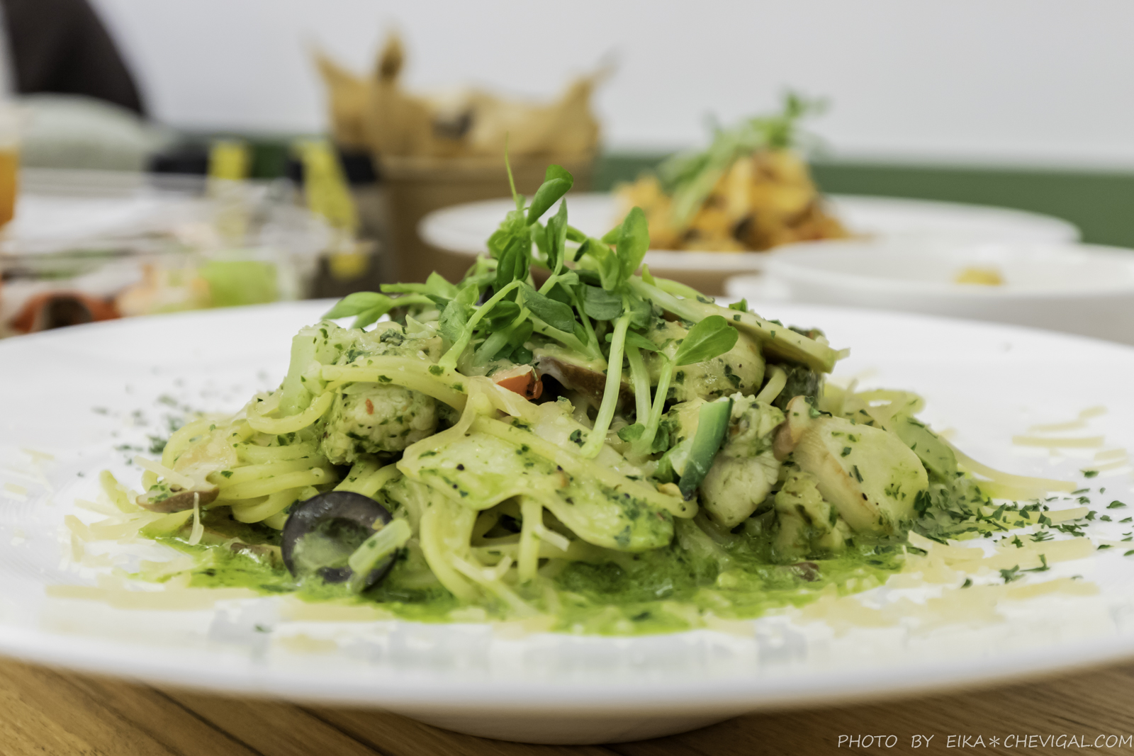 青醬雞肉義大利麵$178元,義大利麵的份量大概有外面的1.5倍左右,女生來吃應該會吃得非常飽;裡面有鮮嫩雞肉、小黃瓜、苜蓿芽、黑橄欖等多種食材,吃來爽口不單調。