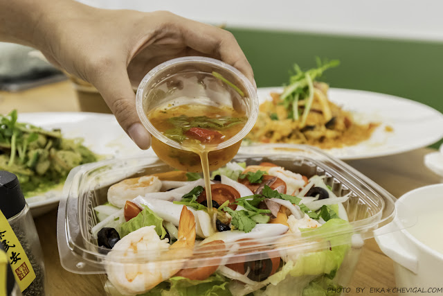 泰式醬料的香氣清爽,帶有微微的酸辣,尾韻還有自然的甜度,全部一次倒入也不用擔心口味太重,裡面的蝦子更是大隻,三人分食還差點吃不完,如果盛裝的容器可以環保一點會更好。