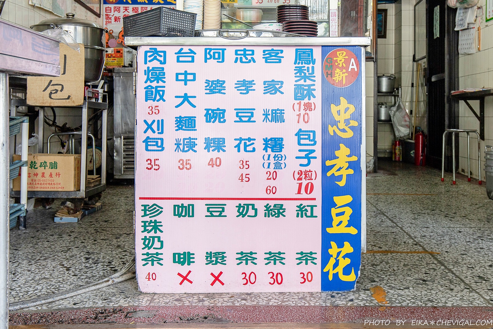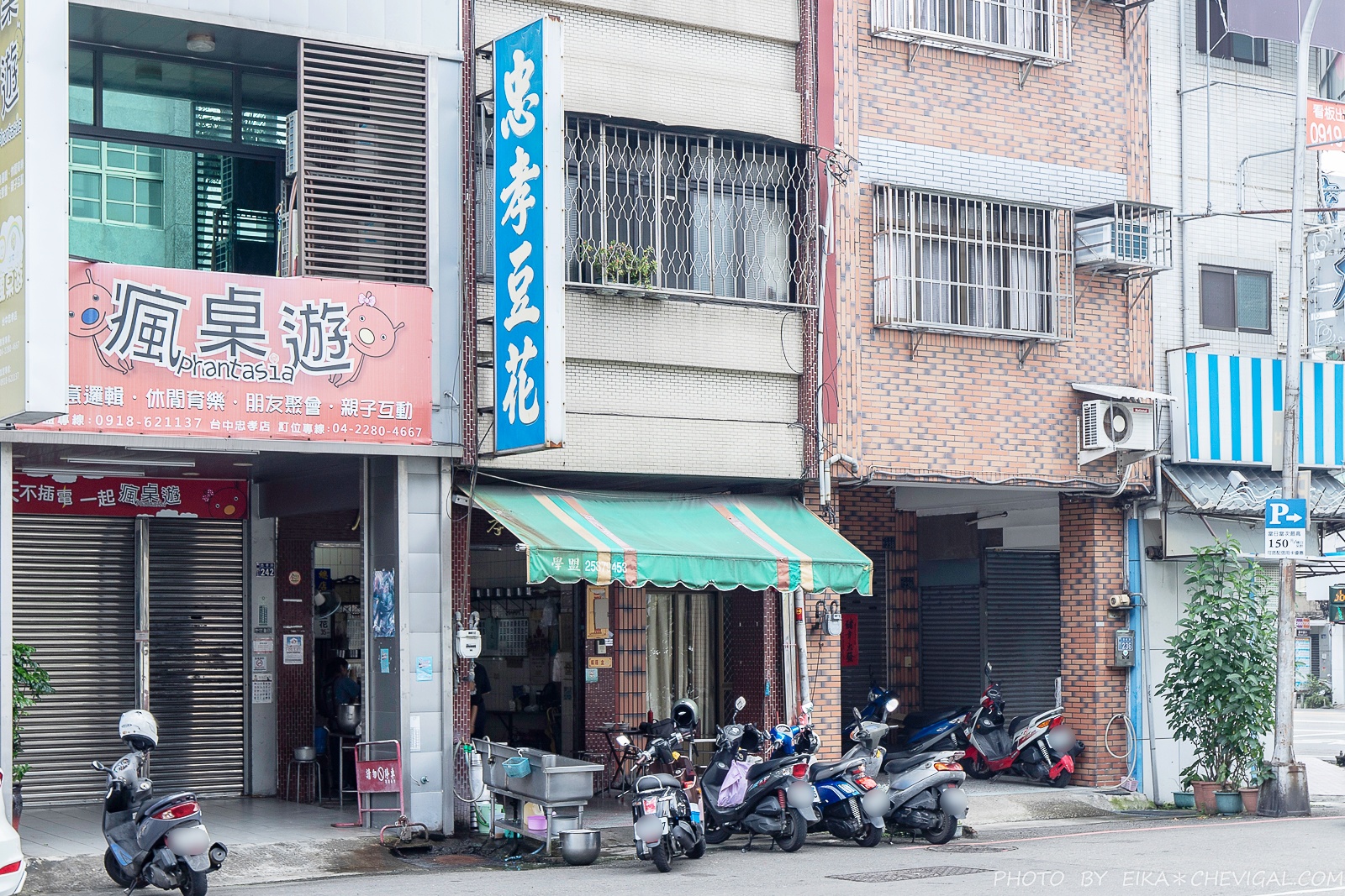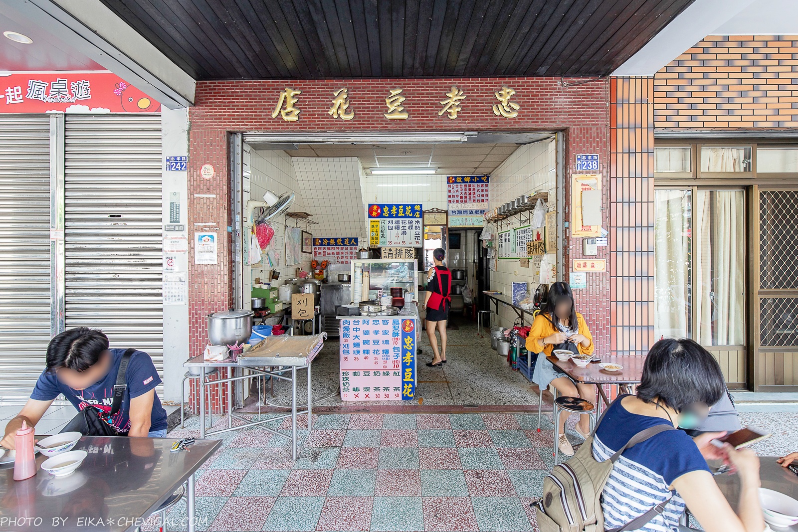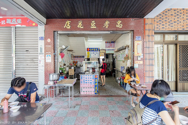 忠孝豆花的座位並不多,大部份的客人都會坐在騎樓下的位置,特別簡單隨意。雖然沒有冷氣或電扇,不過這天的天氣還算涼爽,倒是不會太熱。