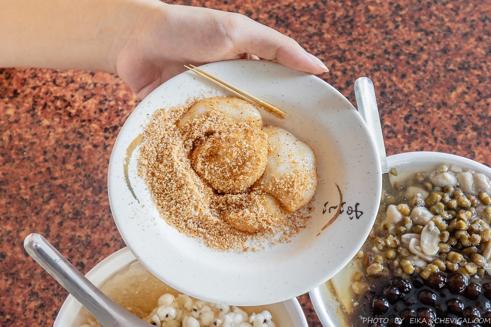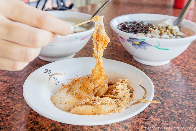 除了各種甜湯之外,這裡也有鹹食可以選擇,像是大麵羹、肉燥飯與刈包等等,不過我們看到竟然有客家麻糬,覺得有些新奇,忍不住點了一份來試試。