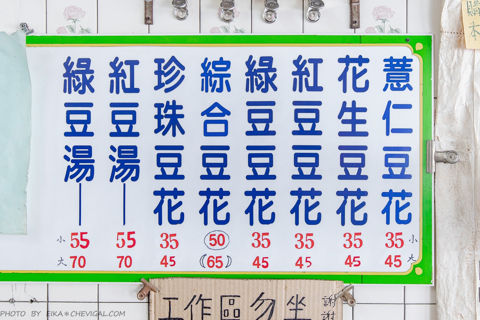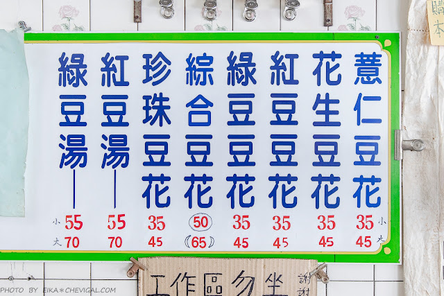 豆花總共有六款,有分大碗與小碗,其中綜合豆花不知道是不是可以自己挑配料的,店家沒有多講,我們也沒有特別多問,就讓店家自行幫我們搭配囉~