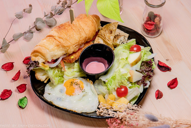 豪華清新夏威夷可頌$199元,除了附有前面所提及的水果沙拉,另外還煎了一顆美麗的半熟蛋,帶點流動感的蛋香特別迷人。