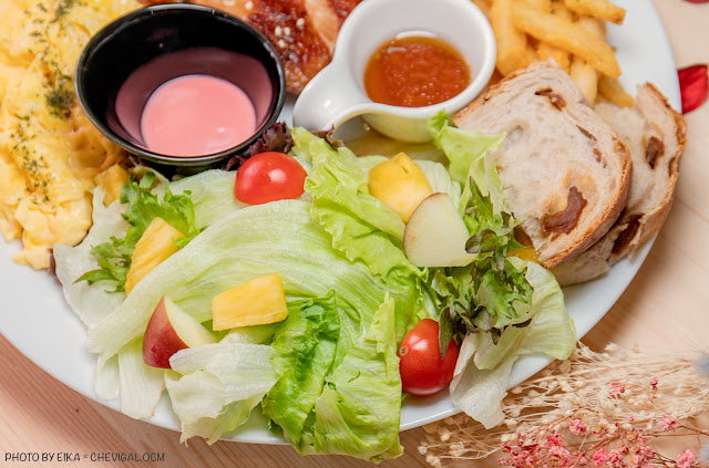 生菜的份量不少,裡面還搭配了各式水果,還能選擇淋上莓果優格醬或油醋醬,風味層次十分豐富。