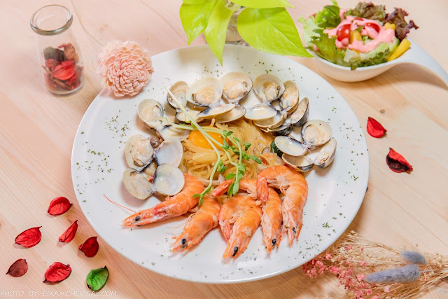 月見海鮮麵$259元,蔚蒔的義大利麵有四款醬料可以選擇:番茄、奶油、羅勒與辣醬,我們這天選的是奶油醬料。一上桌就看到擺得滿滿滿的海鮮,幾乎快要看不到麵條,真的很有誠意啊!