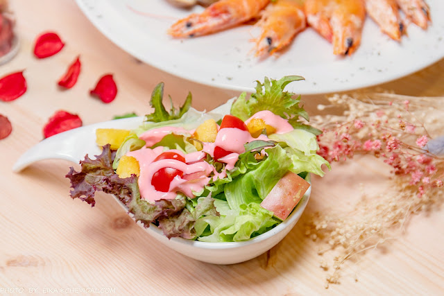 每份義大利麵皆附有生菜,雖然我們平常並沒有特別愛吃生菜,不過這款沙拉裡面搭配了多種水果,像是番茄、鳳梨與蘋果,再淋上莓果優格醬,看起來特別繽紛,吃起來也很開胃~