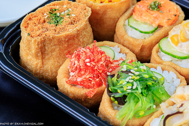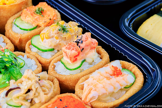豆皮壽司與單純僅有豆皮的稻禾壽司相比,不但可以吃得到豆皮微微的清甜風味,色彩也更加繽紛,像我們自己覺得干貝唇豆皮壽司的口感特別有彈性,海帶芽豆皮壽司也蠻爽口的。