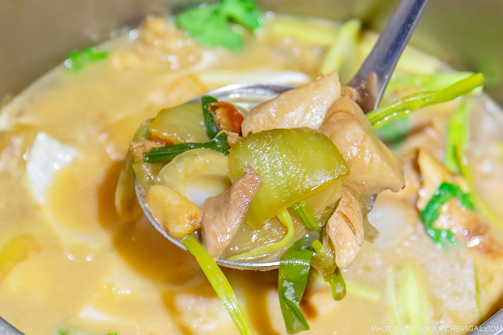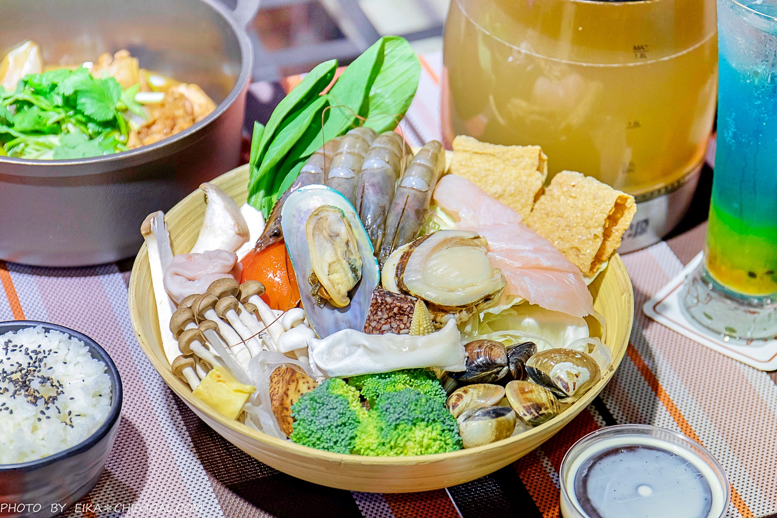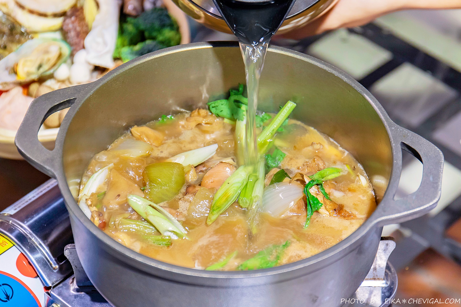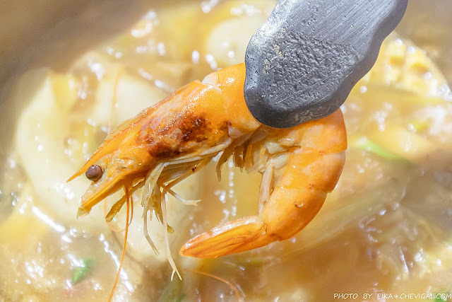 每鍋都會附上一大壺店家以大量雞骨、蔬果熬製而成的湯頭,喝起來更顯溫潤順口,完全沒有酒精的刺激與苦味,搭配蔬果、海鮮的風味都蠻不錯的。