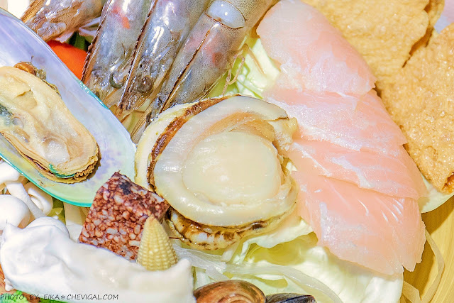 海鮮拼盤的份量不少,除了各式蔬果之外,裡面的海鮮有孔雀貝、帆立貝、鮮魚片與紅腳蝦,以兩個女生共鍋來說沒問題,如果是一個人獨享的話,恐怕會需要打包XD