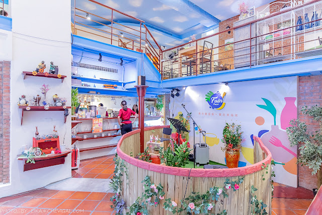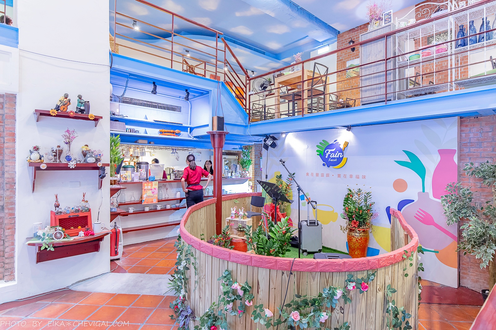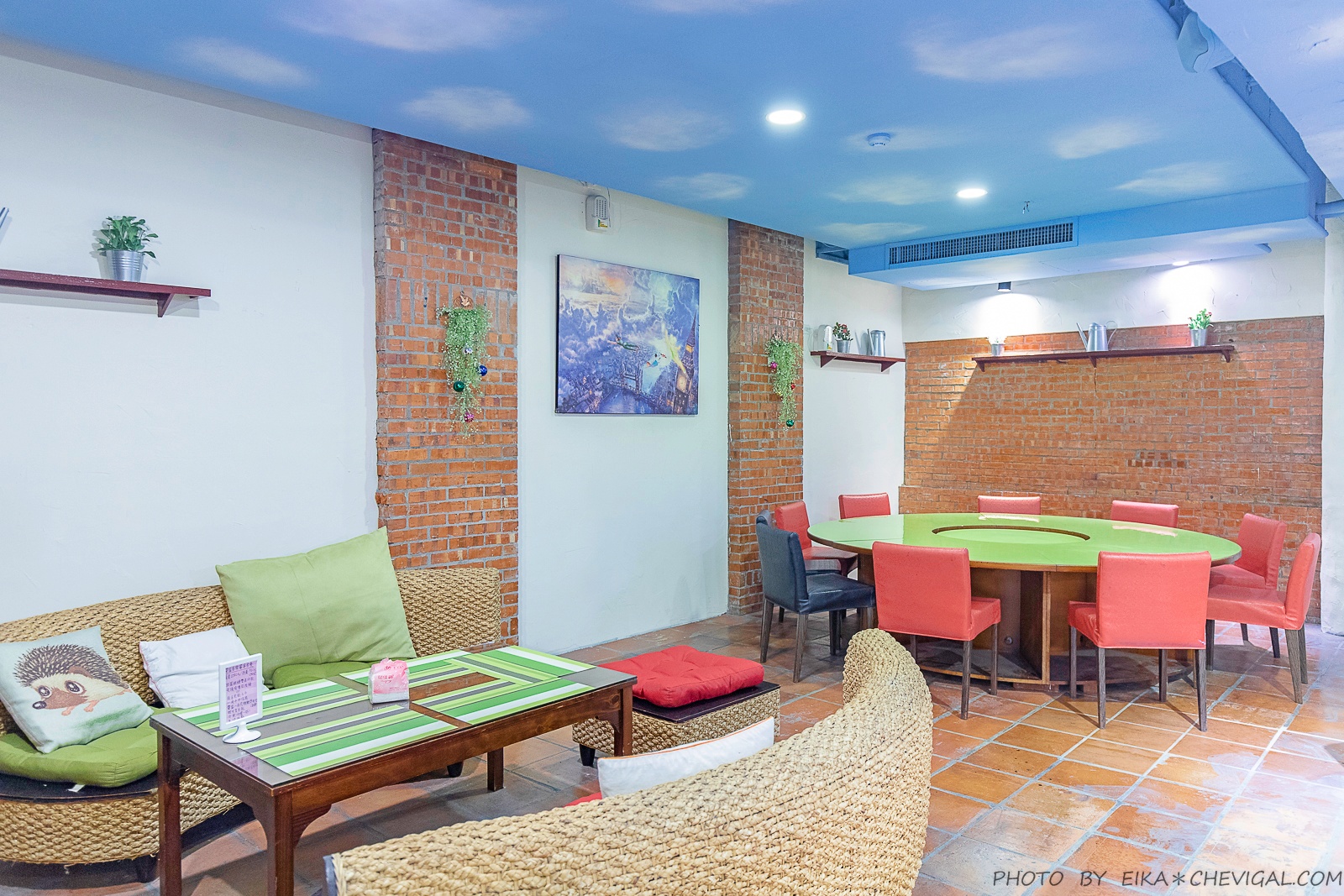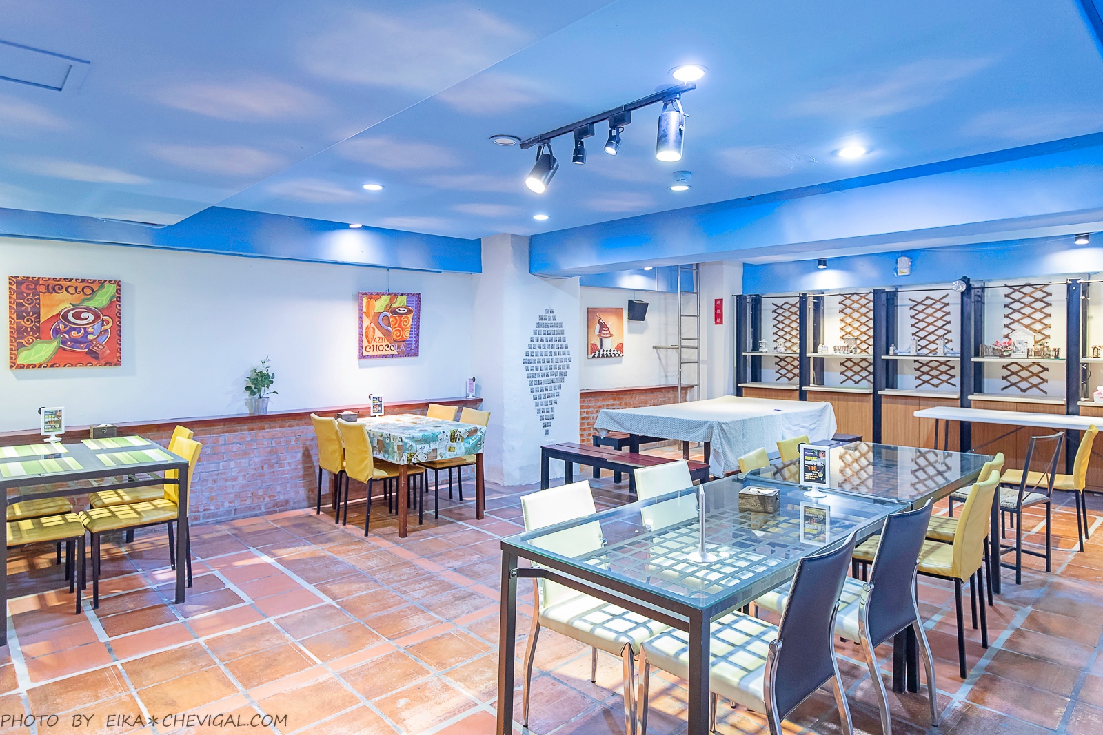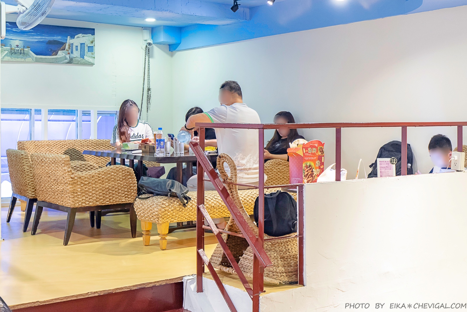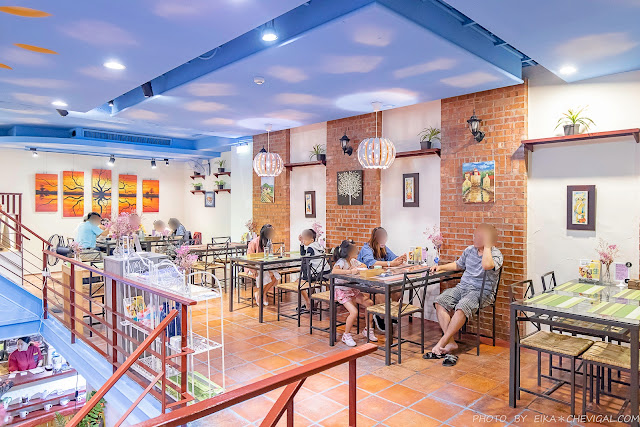 整間餐廳的格局主要以樓中樓為主,寬敞的用餐空間結合了歐式的鄉村風格,並融入了地中海的蔚藍色彩,讓人覺得放鬆不壓迫。