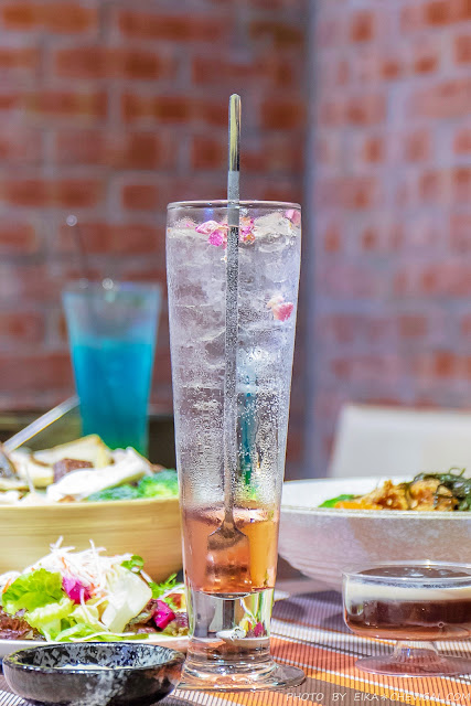 玫瑰威士忌氣泡飲$140元,輕透晶瑩的色澤,表面還撒有浪漫的玫瑰花瓣,這杯根本美到讓人捨不得喝掉!裡面加的是威士忌糖漿,喝起有著淡淡的花香與酒香,不用擔心有酒精的成份。(開車不喝酒,喝酒不開車)