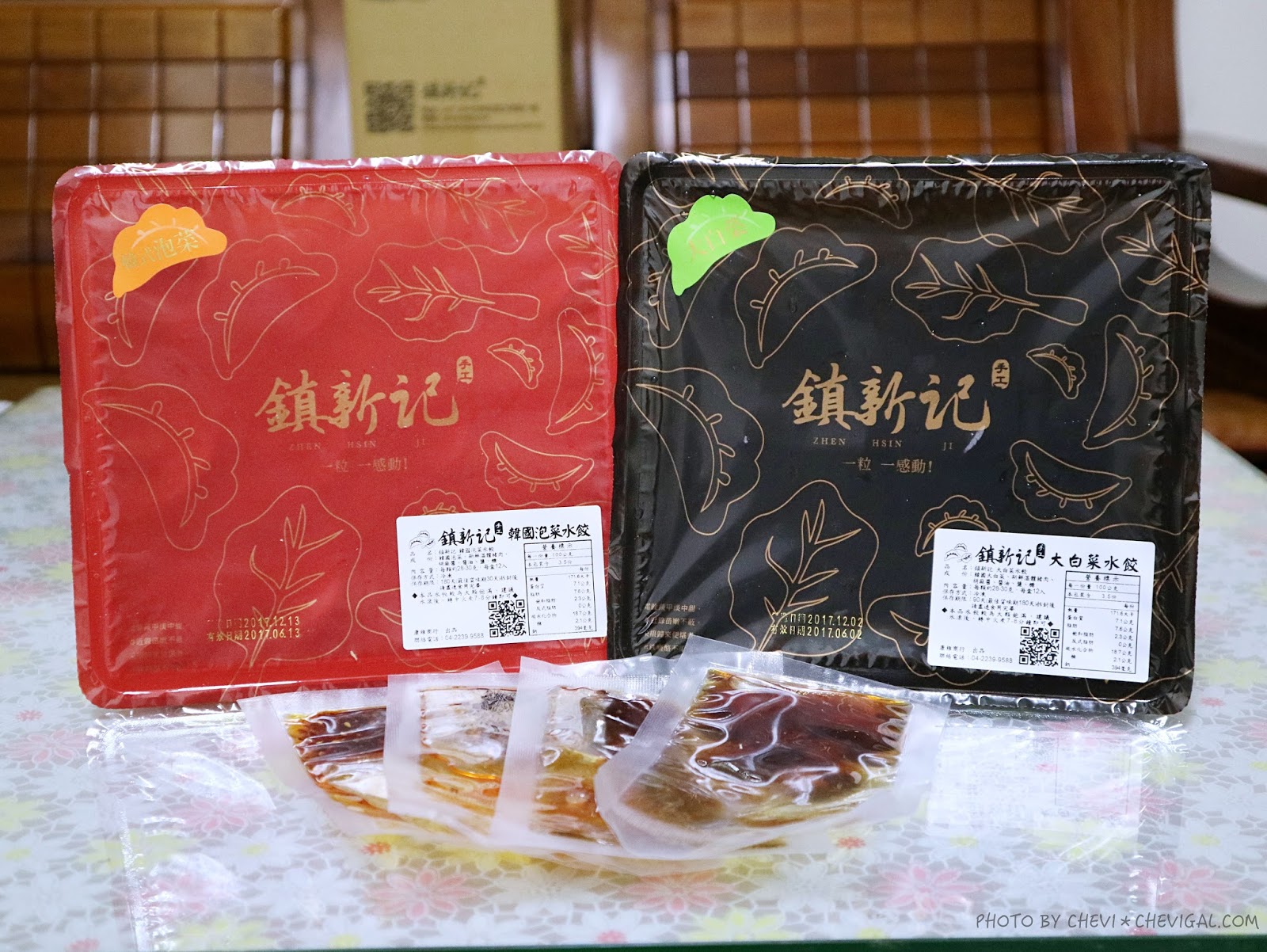 其中黑色的三盒是大白菜水餃,紅色的兩盒是韓國泡菜水餃,每盒皆有12顆,口味的盒數都可以自行搭配。
