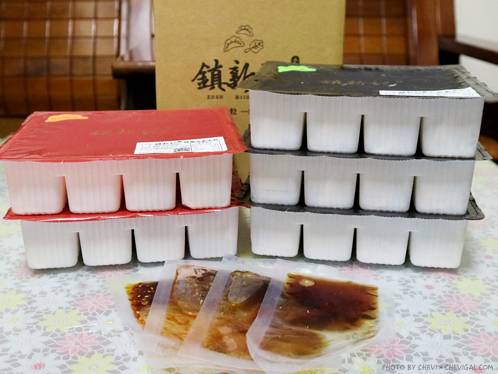 我們這次訂了一箱的水餃,開箱之後可以拿到五大盒水餃和四包沾醬。