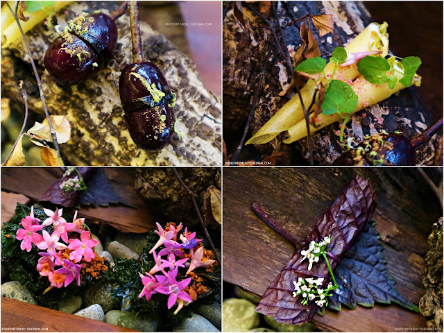 尾聲的小點,無論是葡萄中包夾著紅酒凍的濃醇,或是以蘋果包裹芒果的甜蜜清爽,甚至是其他的口感與風味,各有不同層次與風情,森林處處都有意想不到的驚喜。