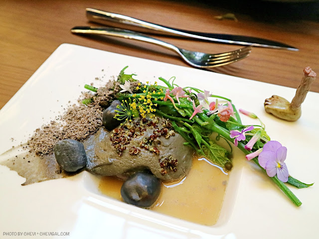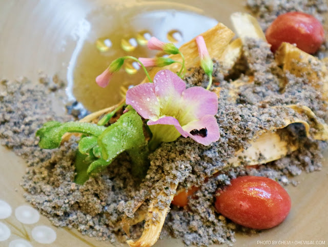 綠色的冰花吃來飽滿且略微脆口,粉嫩的酢醬草微酸,一旁類似牛蒡的食材竟然是酥脆的筊白筍,整體的香氣、色彩與口感都很繽紛豐富,儼然就是一座生機蓬勃的花園。