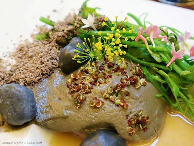 潮濕泥上印著腳印,這道可以說是讓在座朋友最為驚訝與驚豔的菜色,眼前除了右上腳的陶製小腳,其他的土壤、石頭、花草全部都能食用。