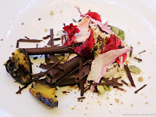 沒想到木炭竟然是蜜地瓜的化身,花落的色彩依舊鮮豔、南瓜子的獨特堅果香氣更為明顯,搭配上香草氣味的冰淇淋與70%的巧克力,微微的冰涼流露出醇厚的風味,就像夜晚的涼意、初秋的氣息悄悄到來。