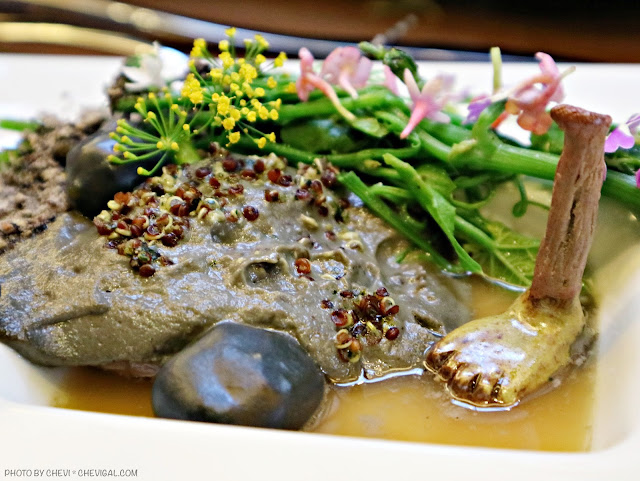龍鬚菜與酢醬草流露出綠意的強韌與清新,而濕土內則包裹著極其滑嫩的鵪鶉肉,彷彿在這片潮濕地之下醞含了豐盈的生機與能量。