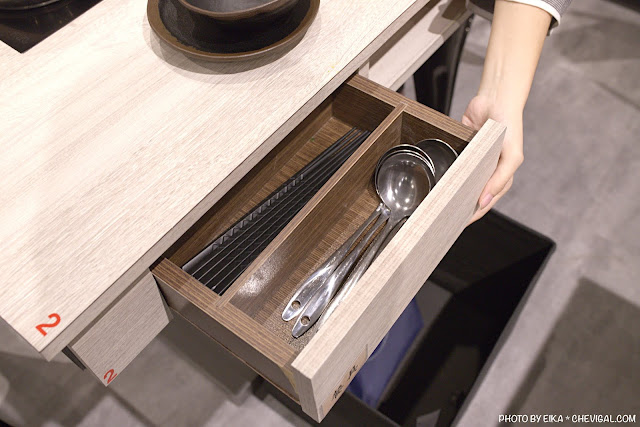 桌邊有抽屜可以拿取餐具,腳邊也有置物籃,算是還蠻貼心的。