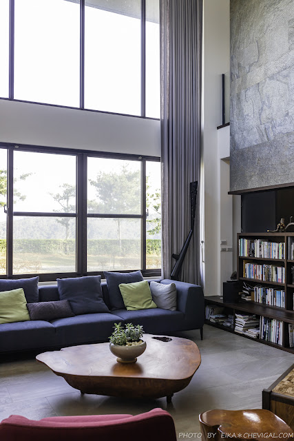 客廳同樣採挑高的設計,加上有著近整面牆面的玻璃窗採光,白天不用特別開燈就相當明亮。不管是想要慵懶地賴在沙發上,或是接待親朋好友也不失大方。