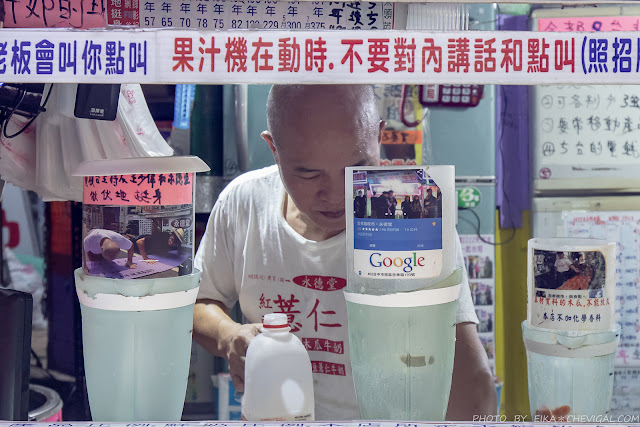 也因為攤位外的標語真的非常多,你們必須要稍微往內探頭才會發現老闆的身影。不過千萬不要馬上衝動跑上前去點飲料,也不要隨便稱呼老闆為阿伯,耐心地站在攤位前等著老闆請你們點餐就對了!