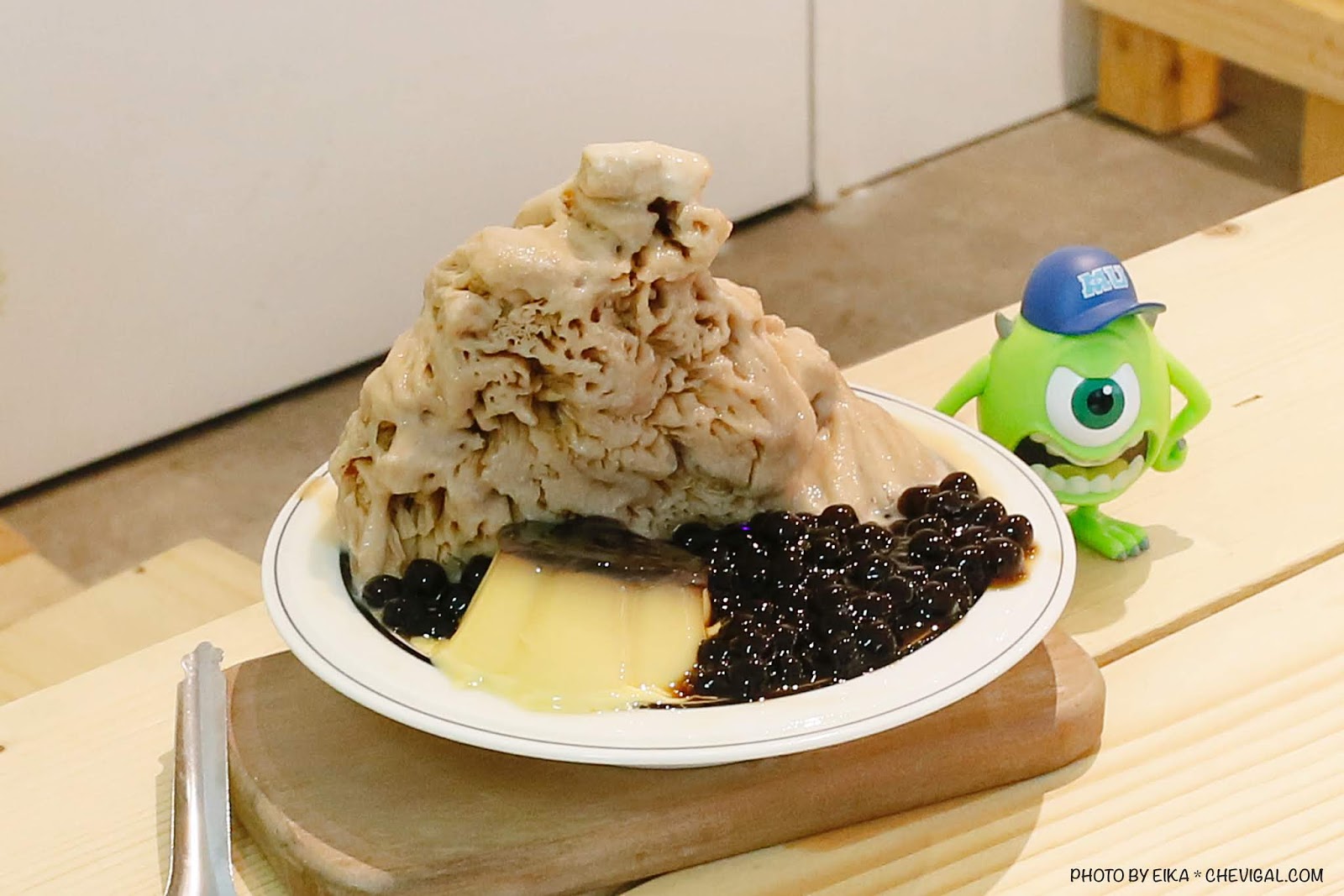 朋友點的布丁珍珠奶茶也很大盤,堆成像小山一樣高的珍奶雪花冰,吃來香濃而不甜膩;盤緣滿滿的珍珠與古溜的布丁也很有口感。下次有來到東勢遊玩,不妨可以來到這間文青冰店吃吃冰消消暑,分享給你們唷~