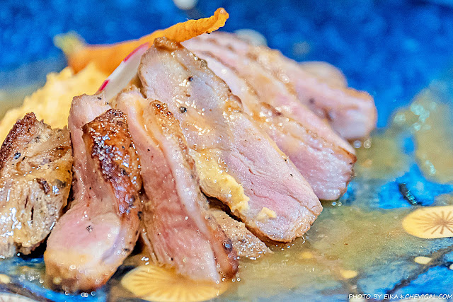 真的要和你們特別推薦高沐的櫻桃鴨胸,經過舒肥的口感相當軟嫩多汁,鴨皮也很有彈性,完全不顯乾柴澀口;另外再淋上紅酒與雞骨熬製而成的醬汁,口味恰到好處,難怪一上桌沒多久就被秒殺了XD