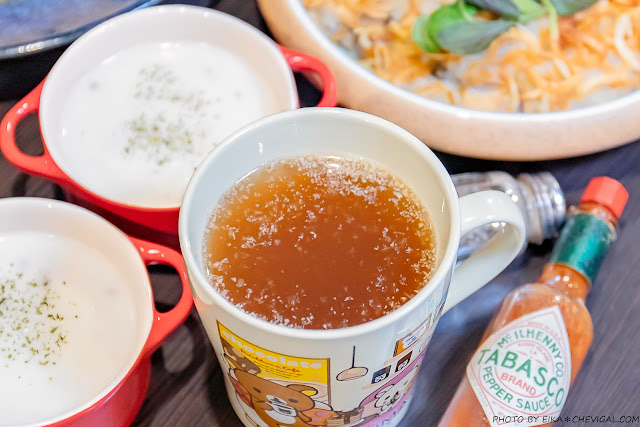 蕈菇濃湯的菇類香氣非常濃郁,滑順的口感當中還帶有奶香,上桌時的溫度也夠溫熱,單喝或沾麵包都蠻好吃的唷!