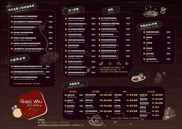 這裡提供高沐最新的菜單給你們參考,除了有基本的義大利麵與燉飯之外,另外還有主廚特別料理、小排餐系列、單點品項、炸物與飲品可以選擇。雖然餐點都是現點現做,會需要一定的等待時間,不過我們自己是覺得不會等太久,製作時間與送餐流程都還蠻順暢合理的。