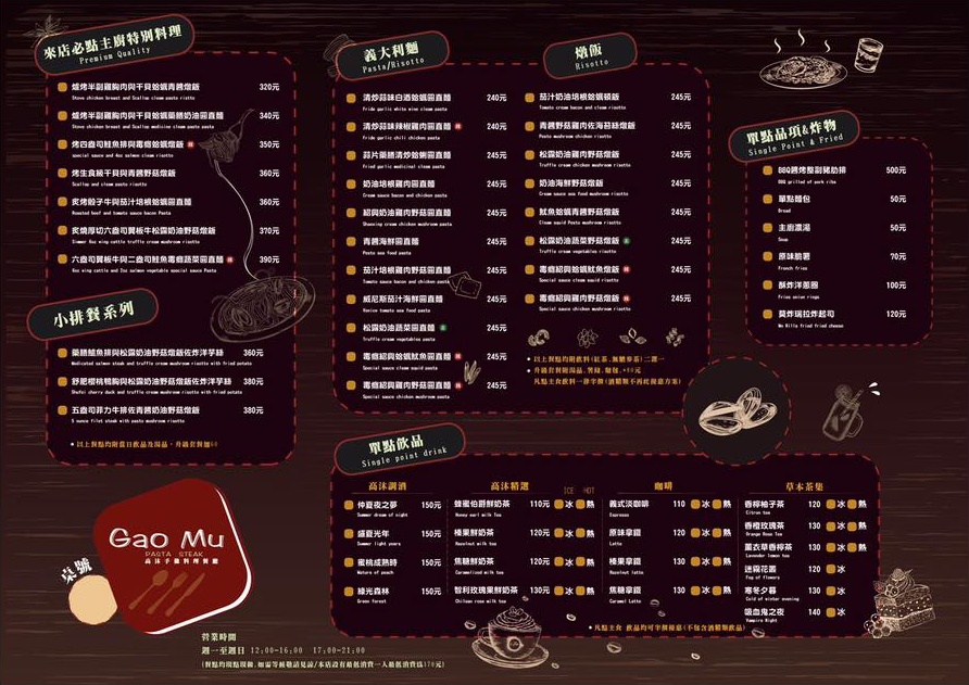 這裡提供高沐最新的菜單給你們參考,除了有基本的義大利麵與燉飯之外,另外還有主廚特別料理、小排餐系列、單點品項、炸物與飲品可以選擇。雖然餐點都是現點現做,會需要一定的等待時間,不過我們自己是覺得不會等太久,製作時間與送餐流程都還蠻順暢合理的。