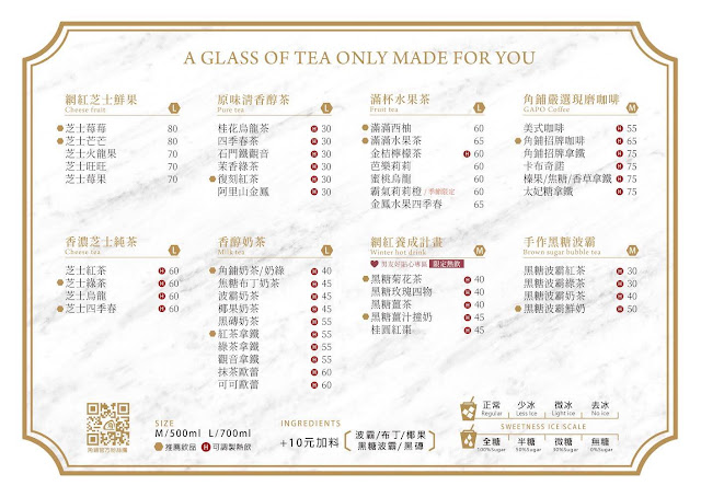 櫃檯還能看到多種茶葉的擺飾,其實除了芝士奶蓋系列的飲品之外,也有一般的單茶、奶茶、咖啡與黑糖系列的飲品可以選擇,據說水果茶也受到許多客人喜愛~