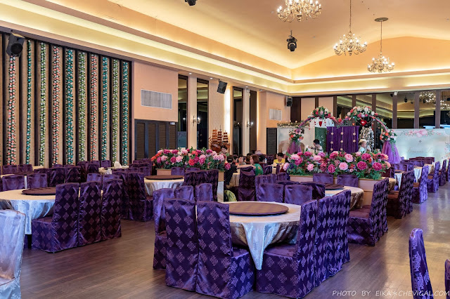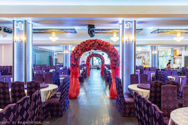 館廳中央還有設置鮮豔的紅花拱門,舉辦婚禮時會再鋪上紅地毯,連接新娘休息室與前方舞台的動線。奢華的紫羅蘭色系搭配上絢麗的燈光,整體的空間寬敞而不失質感。