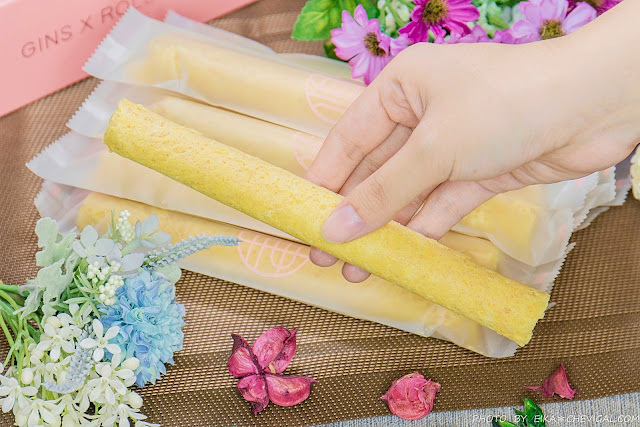 除了對於食材的堅持,就連包裝的設計也讓人眼睛為之一亮!粉嫩的櫻花色系搭配上玫瑰金的燙金字體,優雅柔美而不過份拘謹;另外還能加購同色系的提袋,深紅色的緞面提帶頗具質感,與我們想像中傳統的蛋捲包裝相當不同。