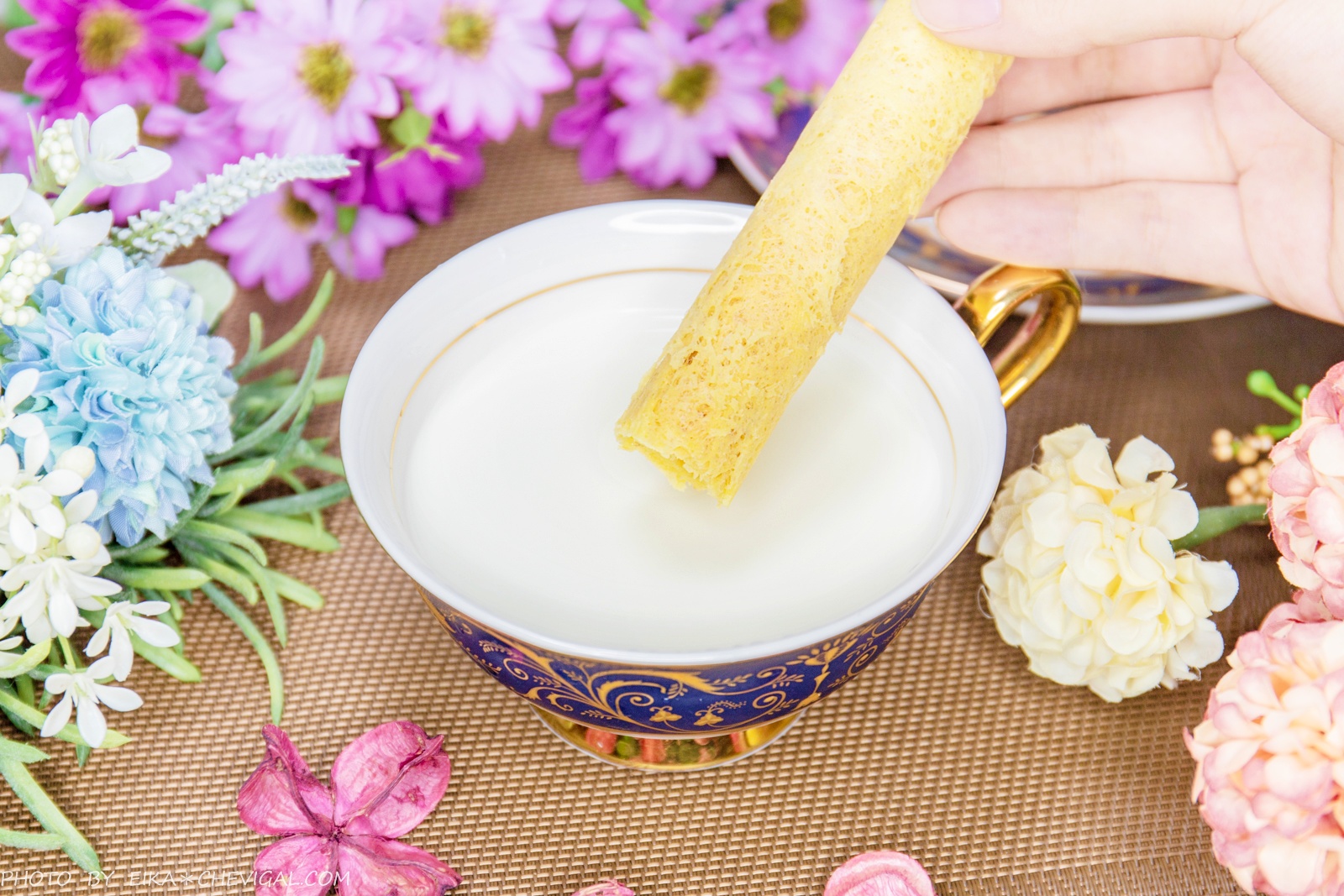 其實這有點像是西式的豆漿搭配油條的吃法,記得只要浸泡幾秒就好,酥中帶軟的口感之中吃得到雞蛋自然的香甜,並帶有微微的奶香。如果是以蛋捲屑搭配牛奶則會比較像是麥片的吃法~