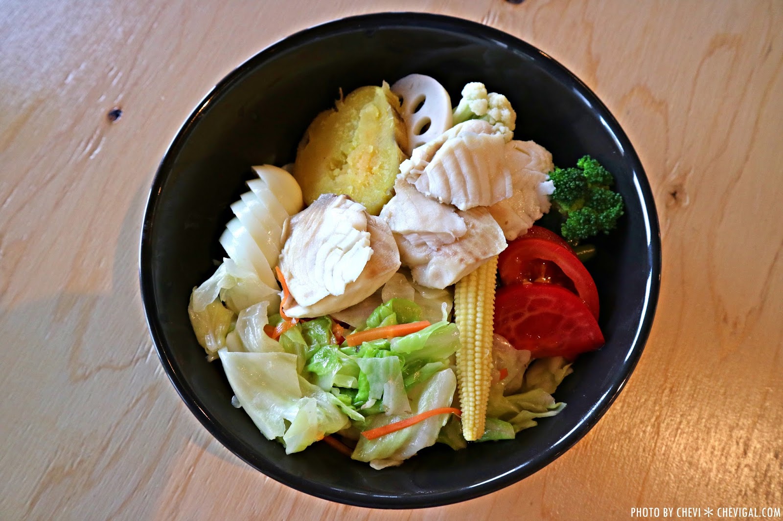 其實整碗的份量算是蠻大的,大概是女生張開兩手手掌捧起來的大小;蔬菜有著青花菜、花椰菜、玉米筍、番茄切片、高麗菜、四季豆、蒸地瓜片與蓮藕……等等,另外還有切好的水煮蛋。