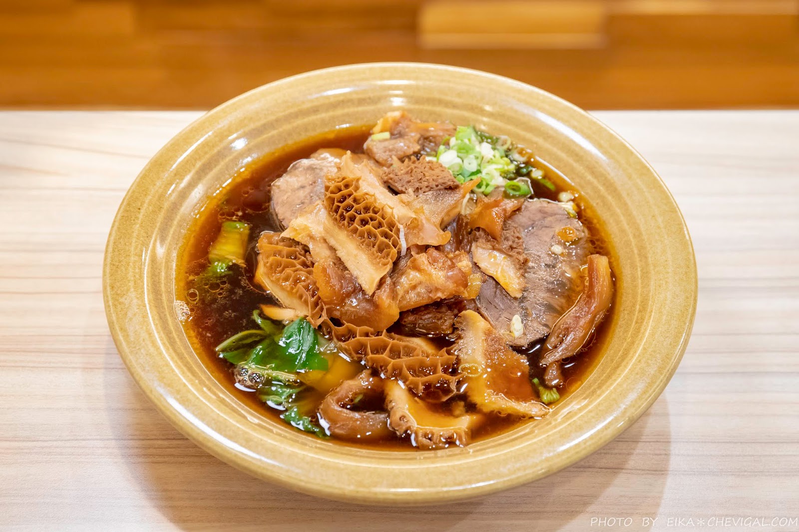 招牌牛三寶牛肉麵$220元,這碗可以說是許多老饕們的最愛!滿滿的腱子心肉、牛肚、牛筋幾乎舖滿了整個碗面,根本看不到麵條,牛肉份量給得超大方!