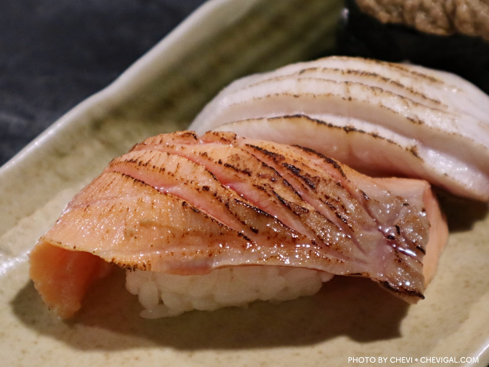 鮭魚壽司($40/個):上頭有經過微微的炙燒,入口後很有飽嘴感,可以感受到整體的味道是很有層次感的,從鮭魚和壽司的鮮甜味,到鮭魚的厚實感,最後是魚肉炙燒後的香氣,真的有讓我們驚豔!