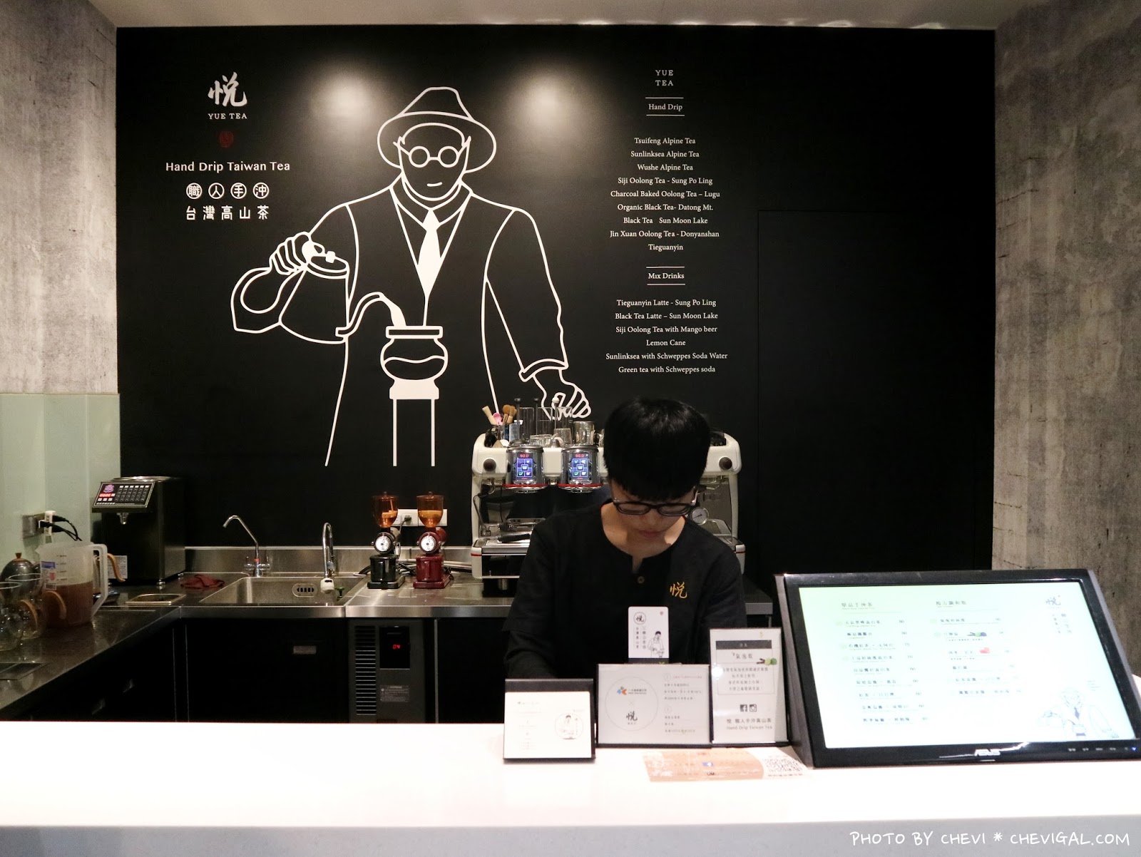 這間飲料店叫做「悅。職人手沖高山茶」,是去年年中才開幕的店家,有別一般手搖茶店,以手沖咖啡方式調製飲品是他們家的特色。