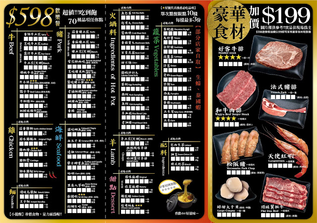 這裡提供好客燒烤的菜單給你們參考,最低$598元起就能享有超過70種豐富食材任你吃,加價$199元更能升級和牛肉排、天使紅蝦、鮮甜大干貝、好客牛排、法式豬排與頂級翼板牛!火烤兩吃則有昆布湯底與麻辣湯底可以選擇,鴛鴦鍋則需另外加價$50元。