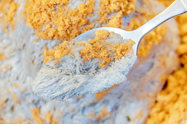雪花冰的質地細密輕柔,但是入口卻又能馬上感受到芝麻的濃郁香氣,搭配上肉鬆香酥的口感,吃起來的口感頗有層次,忍不住會讓人聯想到復古的餅乾口味,還蠻特別的~