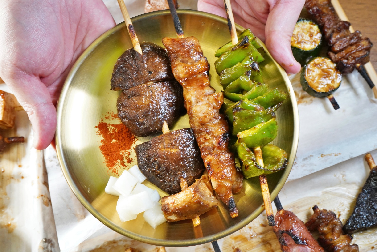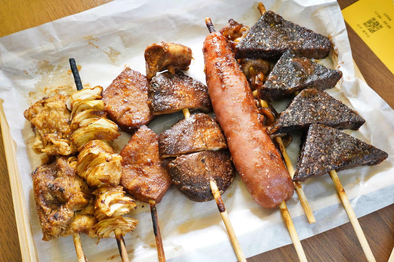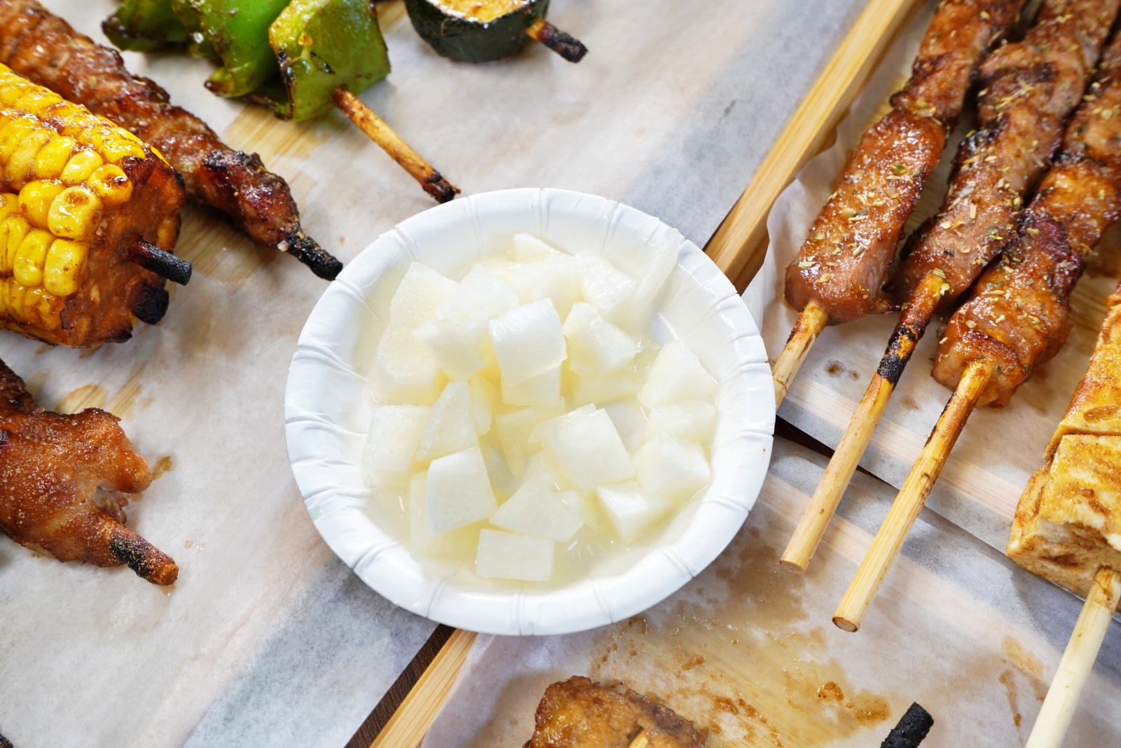 烤好的串燒會用木質托盤送上桌,方便拿取又有質感,店家還會附上一份免費的醃蘿蔔,有吃過「秘醬滷味」的朋友肯定對它不陌生!