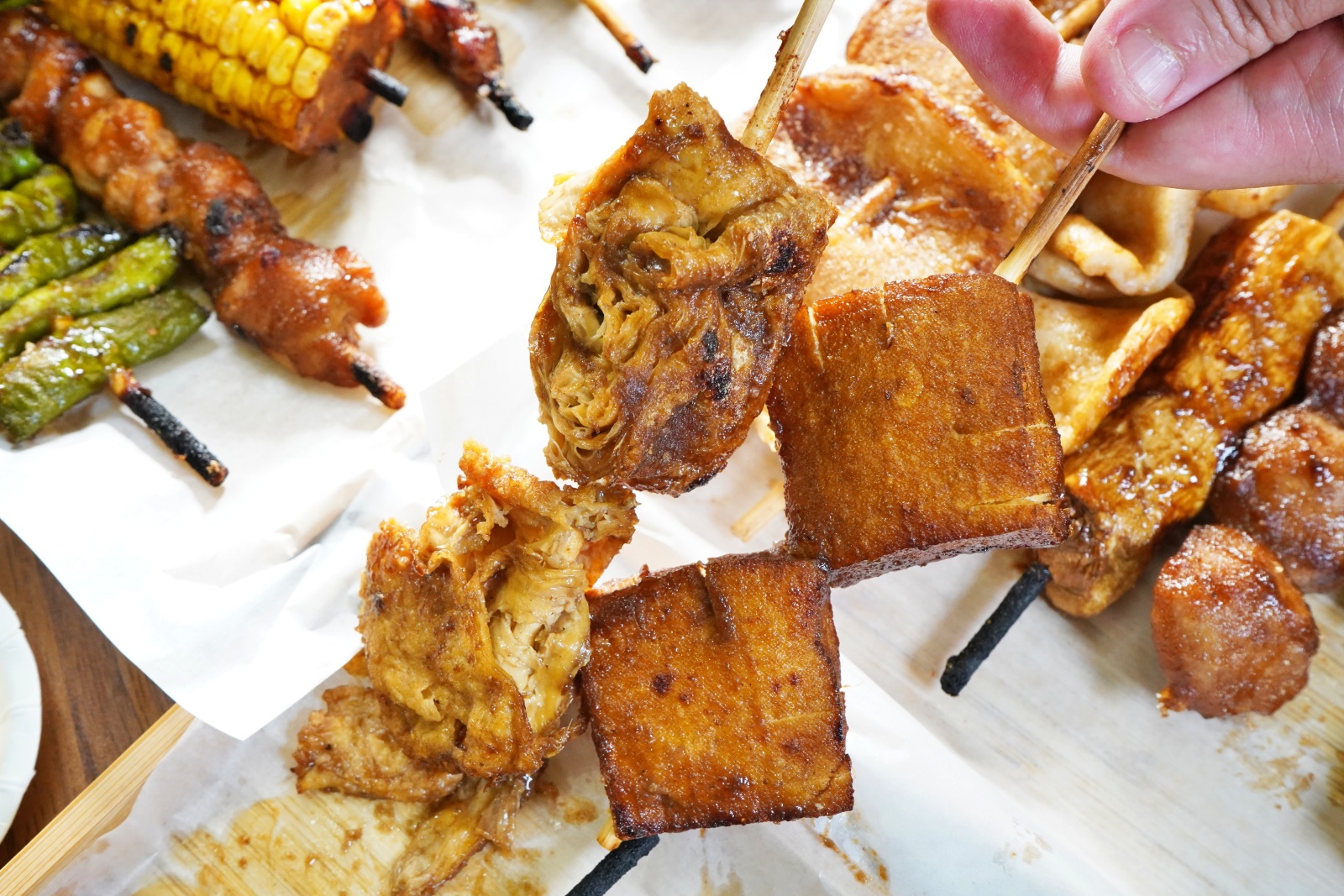 豆包烤得外酥內軟,層層酥香帶著淡淡醬香,每一口都香氣十足。非基改豆乾則保留了濃郁的豆香,搭配微甜的蜂蜜燒烤醬,香氣與彈嫩口感完美交織,吃起來涮嘴又不膩口。