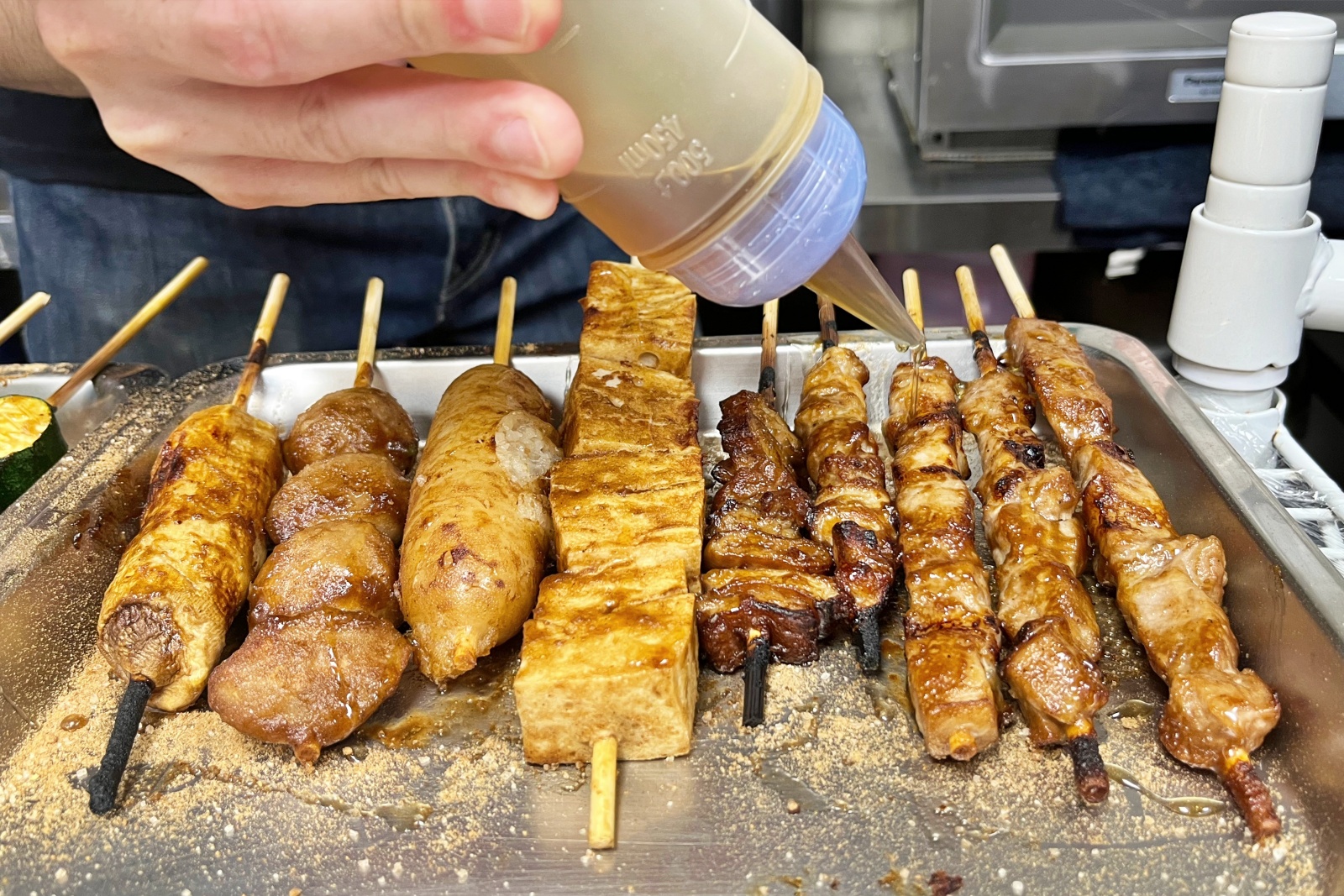 熱騰騰的串燒還會淋上純天然百花蜜,甜味柔和清爽,帶著花香餘韻,讓口感更有層次,不會像一般蜂蜜那樣只有單純的甜。