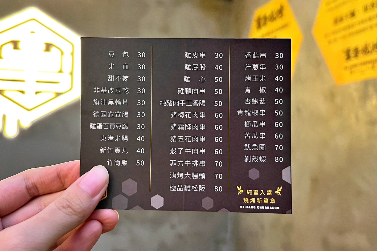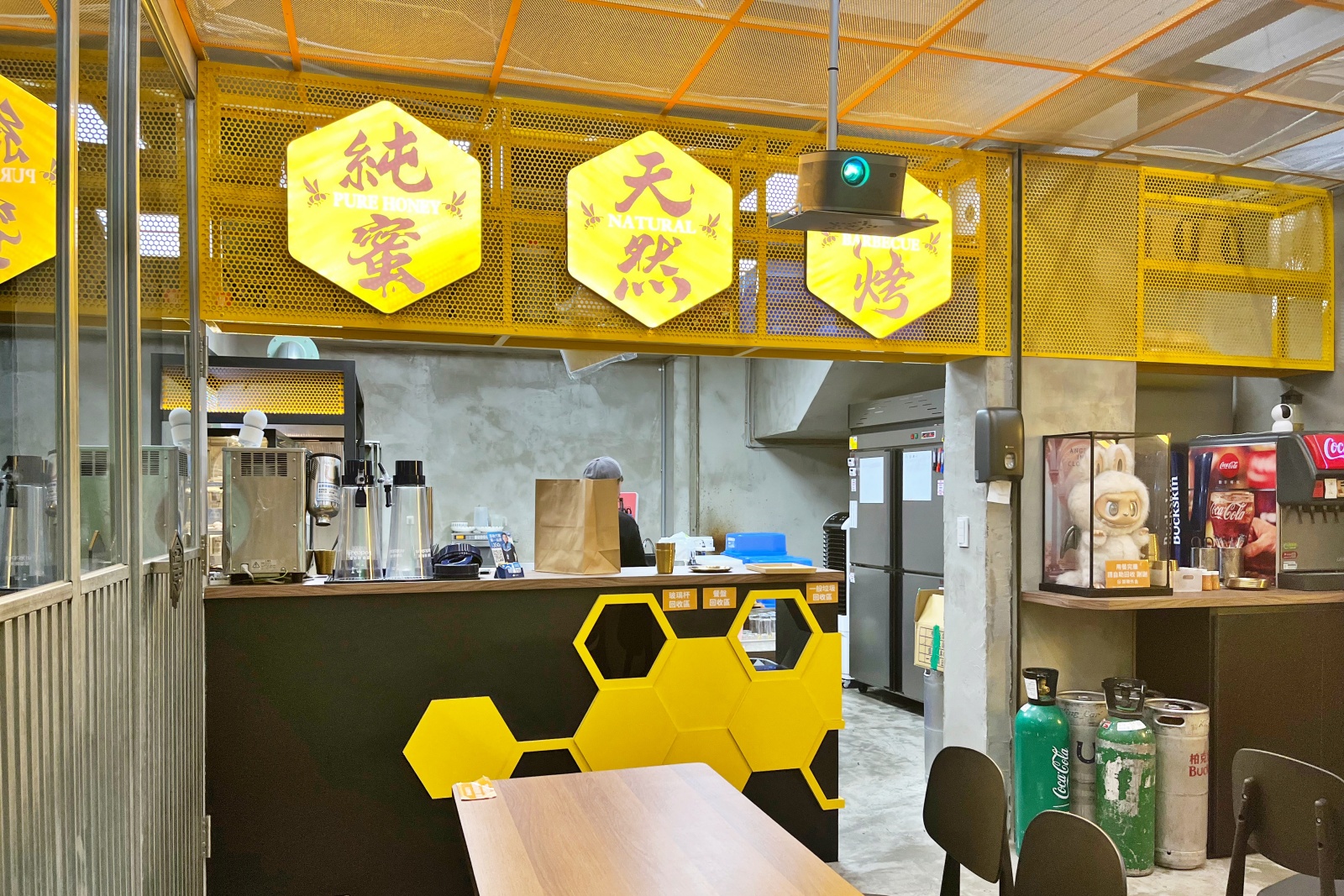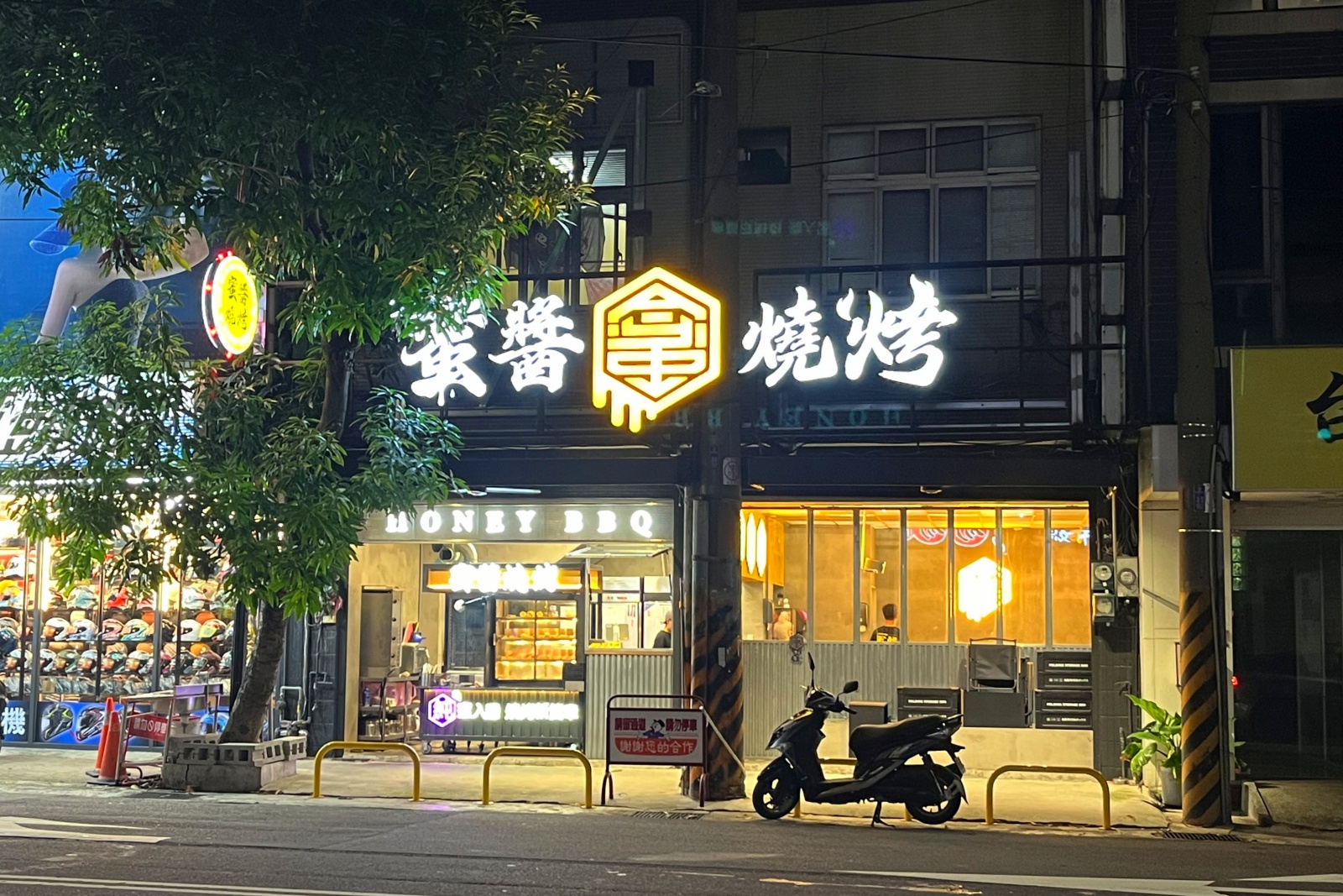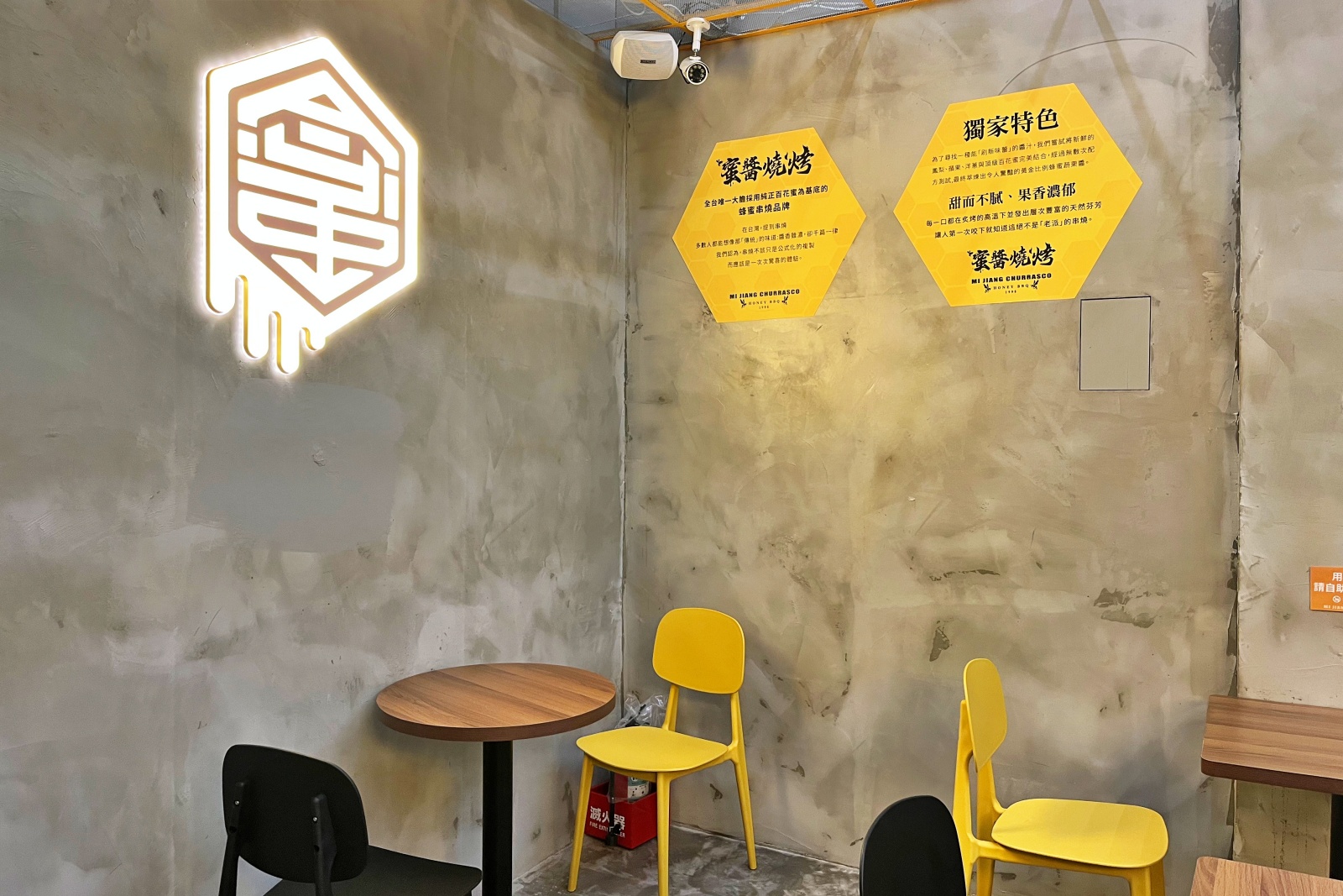蜜醬燒烤逢甲店就位在黎明路與西屯路交叉口,外觀延續品牌的蜂巢元素設計,黃色調明亮又吸睛。